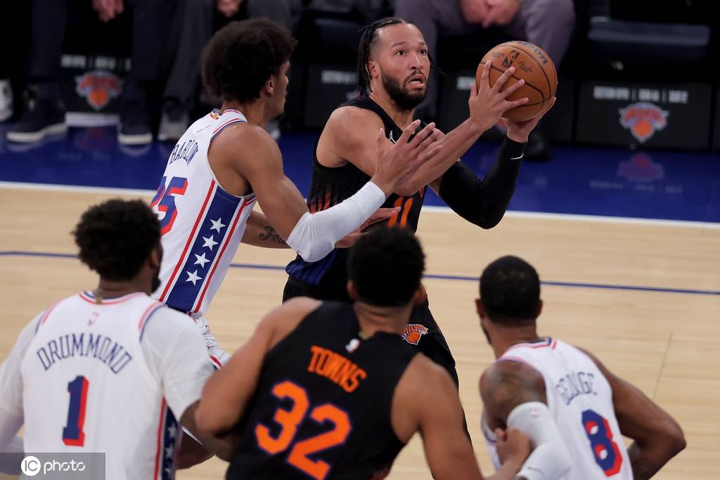 尼克斯队首发:杰伦-布伦森、卡尔-安东尼-唐斯、米卡尔-布里奇斯、约什-哈特、OG-阿奴诺比